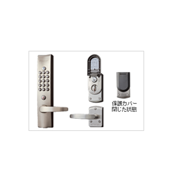 使うたびに数字の配列がランダムに変わるテンキーロックです。通常は暗証番号の入力で解錠、電池切れや暗証番号忘れなどの場合には非常用のキーで施解錠が可能です。電池式なので停電時にも使用可能です。